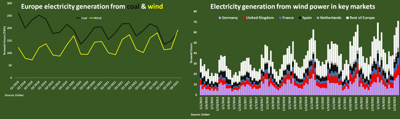 The shift occurred during the last quarter of 2023: Europe's utilities generated 193 terawatt hours (TWh) of electricity from wind sites during October- December against 184 TWh from coal-fired power plants.
