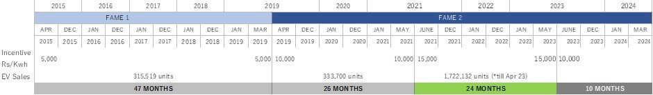 The scheme's first phase began on April 1, 2015, and was extended till March 31, 2019. The second phase commenced on April 1, 2019, for a period of three years, which was further extended for a period of two years up to March 31, 2024.The MHI has now reduced the demand incentive from ₹15,000/kWh back to ₹10,000/kWh, and cut incentive cap to 15 percent, bringing back the incentive amount to the same level as it was till May 2021.