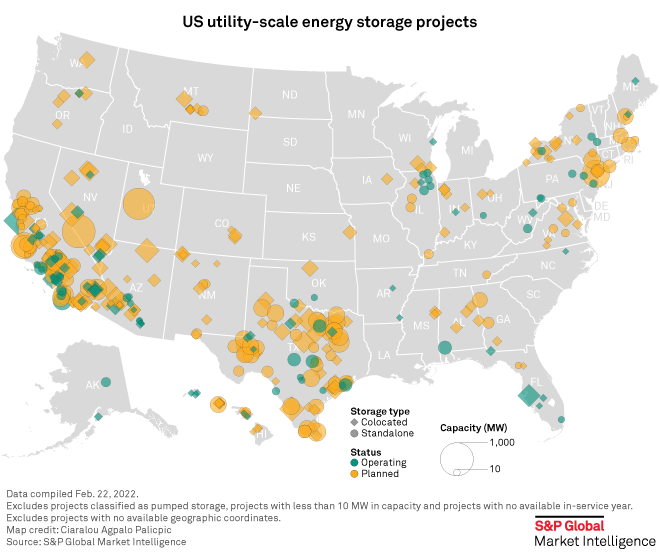 California and Texas are at the center of the U.S. energy storage market. Combined, the Golden State and the Lone Star State had nearly 3 GW of power storage capacity online entering 2022 and another approximately 20 GW planned.