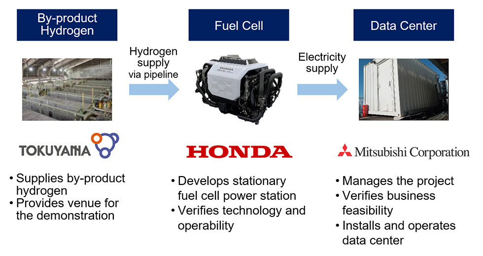 Honda Motor Co., Tokuyama Corporation, and Mitsubishi Corporation have announced a joint demonstration to operate a data center using by-product hydrogen and a stationary fuel-cell power station designed to reuse hydrogen fuel-cell systems from fuel cell electric vehicles (FCEVs) in Japan.