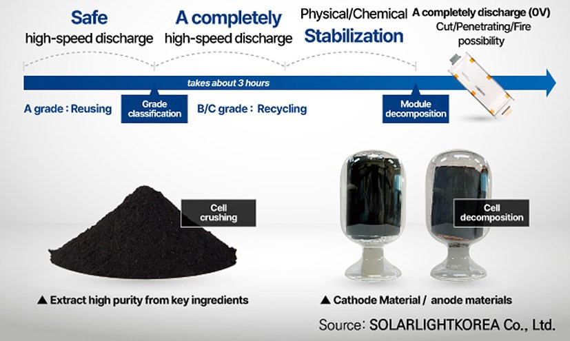 Korea-based battery manufacturer, SOLARLIGHTKOREA CO., Ltd. has announced that it has been to decompose cells and dry extract very high anodes and cathodes using innovative complete dry discharge technology.