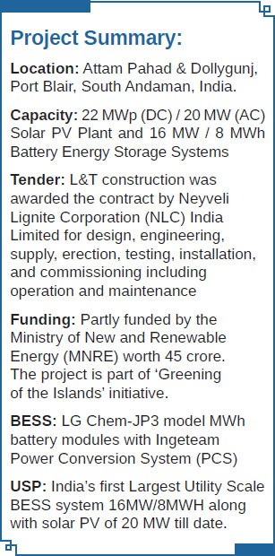 NLC India had tendered the 20MW solar project with BESS to be developed on the island of Andaman & Nicobar in 2017, the auction for which was later scrapped, and a renewed tender was issued in March 2018. This was one of the first tenders in the country that saw solar projects coupled with a battery energy storage system. The project has been developed at Dollygunj and Attam Pahad in south Andaman, and it was effectively commissioned on June 30, 2020.